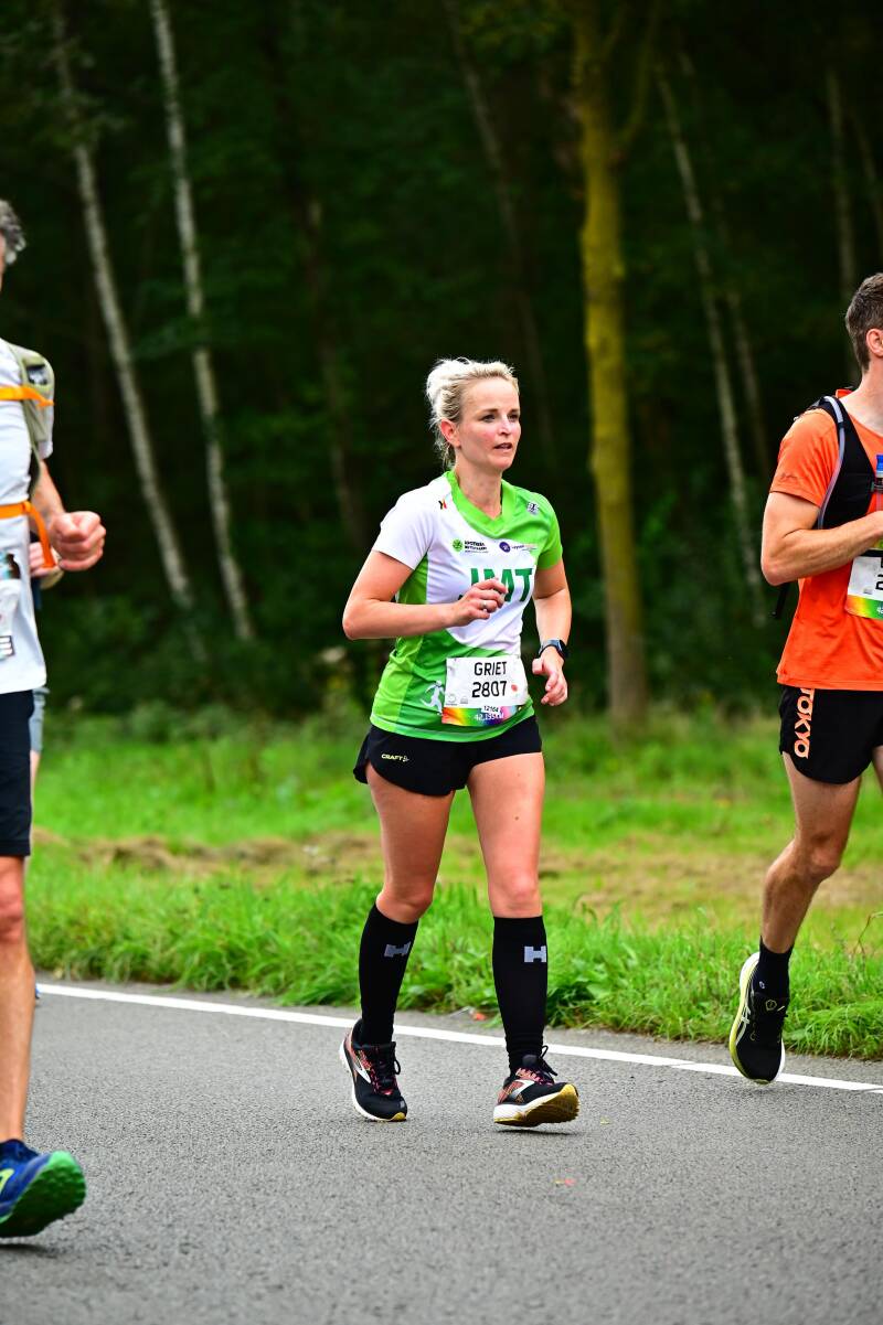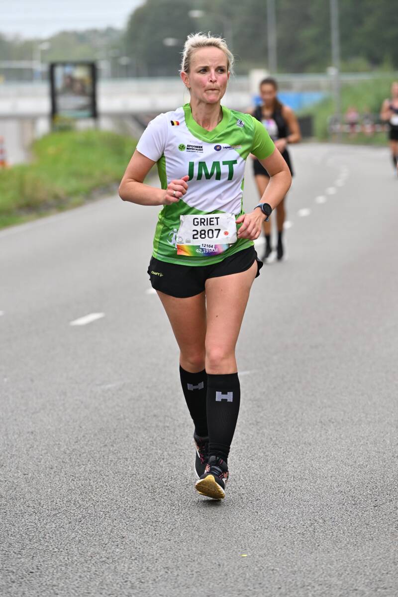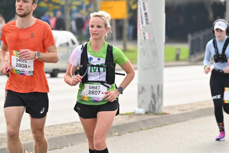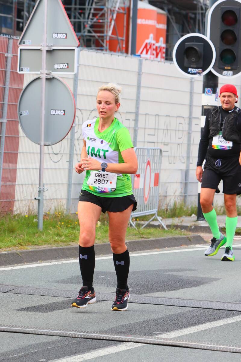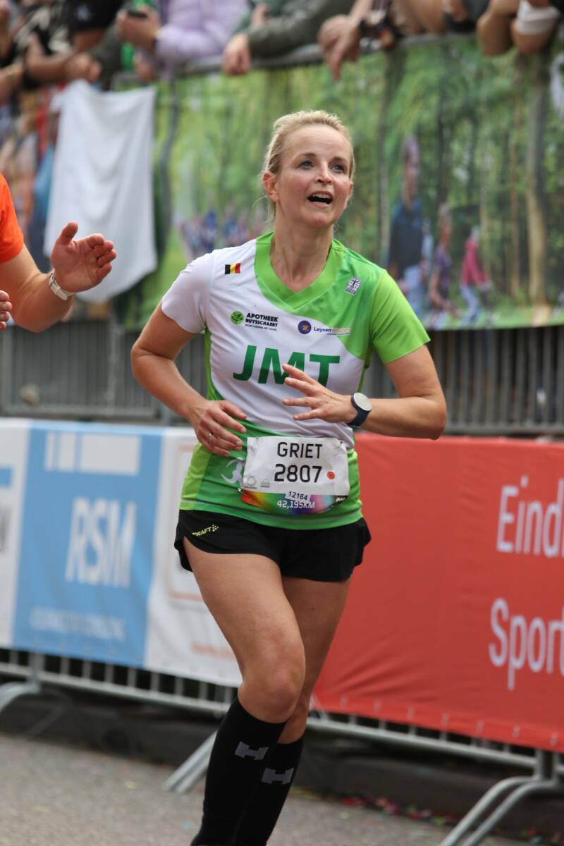 Na die 8km voelde ik me 'opgewarmd'. Ik kwam comfortabel in de race, genoot van het hele gebeuren... de warming up was voorbij. De volgende kilometers tikten weg: 9, 10, 11, 12, 13, 14,.... en zo ging het vlot verder. Heerlijk genieten van de supporters onderweg, zeker van ons eigen achterban: Gunther en Hannah die zorgden voor onze bevoorrading, mentale steun en good vibes elke 5 km (dankjewel vriendjes!!! Jullie beseffen niet wat dit voor me betekende!), onze trainer Michel die me toeriep: "Griet, vandaag gaan we het doen, we gaan het gewoon doen, een JMT'er probeert het niet, die doet het gewoon!!!" (ongelofelijk gevoel en boost dat dat geeft, waarvoor veel dank Michel!). De sfeer, de muziek, al die kindjes die high fives gaven, vreemde mensen die riepen: goed zo, Griet en Dries, de man met de micro die Dries herkende van zijn werk en die door zijn micro ons toejuichte: "hup hup daar gaat die podoloog", alle friends en JMT maatjes aan de kant (zo fijn om bekende gezichten te zien, met special thanks aan Karin die er trouw elke keer weer bij is) ... Kortom het hele gebeuren van een marathon op zich.